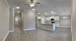 Absolutely gorgeous two-year new home by Scott Ellis Homes! Tile flooring throughout this 3-bedroom, 2 full baths, and 2-car garage house. Home includes an open 10-foot ceiling living space, granite countertops, a large kitchen island, under-cabinet lighting, white cabinets, a separate shower and tub, dual sinks in the master bedroom, a ceiling fan in each room, crown molding, blinds, a frameless shower, a covered back patio, a stained fence, sprinklers, landscaping, gutters, etc. The neighborhood is 5 minutes from L3-Harris, I-30, Local Restaurants, and Shopping.