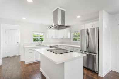 -Contemporary kitchen with white custom cabinetry, quartz countertops, and a large island
