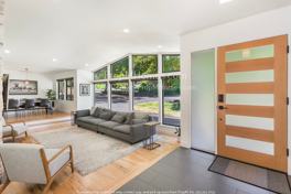 -Grand living space with mid-century charm, vaulted ceiling, and abundant natural light