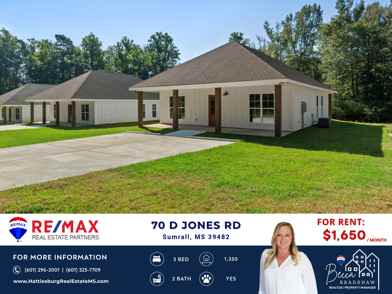 Located in the charming Sumrall area within the Sumrall School District. This new construction rental is nestled on D Jones Road, offering the perfect blend of modern comfort and serene country living. With its efficient and functional layout, this home features stylish finishes throughout, including wood plank flooring, granite countertops, and stainless steel appliances.