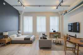 Spacious 709sf layout with queen bed (blackout curtains), dedicated workspace with quality desk/chair, full kitchen (stove, fridge, microwave, air fryer, coffee maker with K-Cups included), in-unit washer/dryer, Smart TV, fast WiFi. Main Street views with natural light.