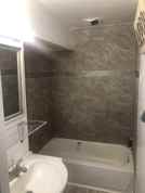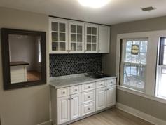 Bright kitchen with subway tile and bar island and new gray wooden floors.