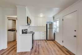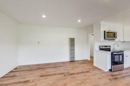 -Open floor plan between living and kitchen spaces with dedicated laundry closet.