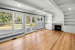 A cozy and elegant living room features coffered ceilings and built-in shelving surrounding the gas fireplace. A wall of windows and French doors overlook the patio and backyard. The adjacent kitchen includes an island, nice cabinetry, solid surface counters, and GE appliances including the electric range, dishwasher, refrigerator, and microwave. The home’s side entry from the carport opens into the mudroom and kitchen. The mudroom has tile floors, cabinetry for storage, and access to the laundry room. The washer and dryer will remain for tenant use but will not be repaired or replaced by the homeowner.