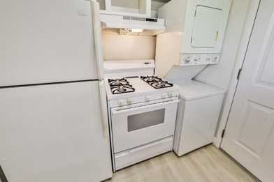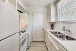 - immaculate galley kitchen with refrigerator and gas stove/oven