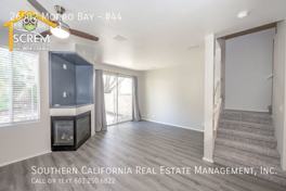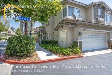 This stunning townhouse, located in the charming community of Cheyenne in Valencia, boasts three bedrooms and two and a half bathrooms. As you approach the private entrance, you'll notice a cozy front porch that leads to an open dining area and living room. The living room features luxury vinyl plank flooring, a ceiling fan, and a corner fireplace. You can access the backyard through the sliding glass door, where you'll find mature landscaping, a fruit tree, and artificial turf. The kitchen has been updated with luxury vinyl plank flooring, white cabinets, self-closing drawers with brushed-silver hardware, and Whirlpool stainless-steel appliances, including a refrigerator, gas stove, single oven, microwave, and dishwasher. The first floor also features an updated half bathroom. Upstairs, you'll find two guest bedrooms, one with double doors and a full updated guest bathroom. The primary bedroom boasts carpet flooring, a vaulted ceiling, a ceiling fan, and an attached bathroom with a walk-in closet, dual sinks, an updated vanity, and a walk-in shower. The attached two-car garage has washer and dryer hookups. Trash is included in the rent. Enjoy the HOA pool, spa, and half-court basketball. This community is located within walking distance of a park, a lake with walking paths, shopping, restaurants, and schools. *Owner may consider a small pet.