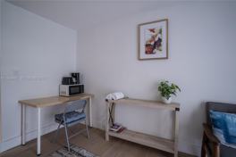 A convenient kitchenette is included, equipped with a mini-fridge and microwave.