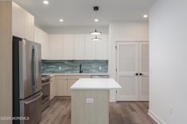 Experience modern coastal living at Tak House in Long Branch's vibrant West End. Unit 301 features 2 bedrooms plus a den, 2 full baths, 9' ceilings, in-unit laundry, and two dedicated parking spaces. The open kitchen features custom cabinetry, quartz countertops, center island, and stainless steel appliances. Direct elevator access to the rooftop deck with ocean views, lounge seating, and TV. Building amenities include keyless entry, package/grocery delivery system, bike storage, beach lockers, and EV charging stations. Just minutes to the beach, shops, dining, and NYC transport.