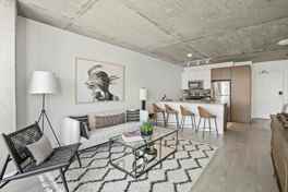 Inside these apartments, the warm earth tones welcome you to a soothing home environment. The uniquely styled kitchen finishes feature a mix of hues with European two-tone white and beige cabinetry, marbled light quartz countertops, gray tile backsplash and stainless steel appliances. Elements of on-trend exposed concrete ceilings and wide plank wood flooring also create a modern loft look. The floor-to-ceiling windows provide brilliant unobstructed views in all directions. Each unit also includes full-size washers and dryers, premium roller shades and keyless entry.