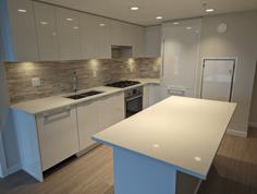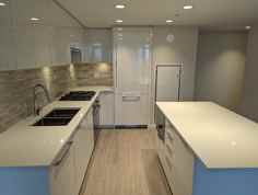 - Overheight custom cabinetry is complemented by engineered stone countertops, sleek polished chrome pulls and under-cabinet lighting.