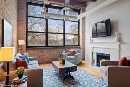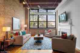 AVAILABLE SEPT 1ST! This rarely available larger 2 Bedroom condo, in the popular Post Card Lofts building, has over 1500 square feet of open space! It includes many loft style features including 14 foot ceiling height, heavy timber, exposed brick, and hardwood flooring. One bedroom is raised several steps, is very spacious and private, and still has 10 ft ceiling height and lots of closet space. There is many amenities including a modern kitchen with white 42" cabinets, granite countertops, SS appliances and an extra large island, which is great for cooking and entertaining. The bathroom has been completely upgraded, There is a large living room with a full wall of windows, wood burning fireplace w/ gas starter, a separate spacious dining area, and more additional floorspace currently used as an office and an additional family/media room. A real unique and flexible floorplan! This unit won't last!