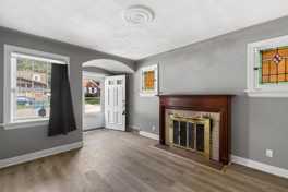 Step into the separate foyer, leading into bright and airy living areas featuring new flooring, fresh paint, stained-glass windows, and a non-functional fireplace that adds character and warmth to the space.