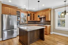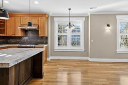 This multi-level home features tall ceilings, large windows, and an open, airy layout filled with natural light. The main living area showcases hardwood floors, a cozy fireplace, and generous space for both relaxing and entertaining. The kitchen is equipped with marble countertops, a gas stove, dishwasher, large cabinets, and a center island, providing ample storage space.