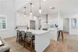 The open-concept layout showcases a chef’s kitchen with quartz countertops, premium appliances, a farmhouse sink, spacious butler’s pantry, and full-height custom cabinetry. The living and dining areas are highlighted by soaring cathedral ceilings and sliding doors that open seamlessly to the oversized lanai with a heated pool and spa—perfect for relaxing or entertaining.