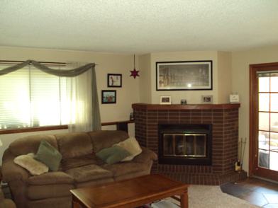Inside, the open floor plan creates a bright and spacious living area centered around a stunning brick, wood-burning fireplace — perfect for cozy evenings. The kitchen is both stylish and functional, featuring granite countertops, a convenient breakfast bar, and stainless steel appliances, making it ideal for cooking and entertaining.