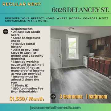 Welcome to 6026 Delancey Street, a charming and well-maintained three-bedroom, one-bathroom home in a convenient West Philadelphia location. Priced at only $1,550 per month, this spacious house is perfect for those seeking comfort, style, and proximity to local schools and amenities.