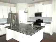 The kitchen is built around a large center island and counter height bar that seats 4. There are white shaker cabinets, granite countertops, stainless-steel appliances, and a full-size pantry. the kitchen is all open to a super spacious living room—ideal for everyday living and entertaining.