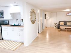 Kitchen has been updated with subway tiles, cabinets and dual oven. Shared front loading washer and dryer with 2 other suites.