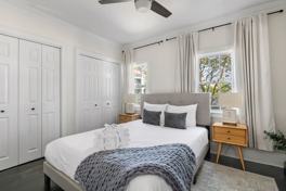 Just down the hallway are the two bedrooms and bathroom. The first bedroom you will come across is set up as more of a flex-space. Here you will find a large desk with a comfortable chair, perfect to accommodate all of your work from home needs! There is also a twin size day bed which is great for overnight guests! The primary bedroom is at the front of the house and features a queen size bed, and a smart TV! The bathroom offers a hotel-like feel with a vanity, and tile shower with a rain head.