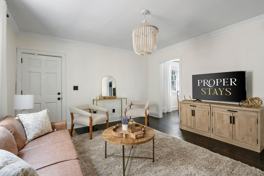 Enter through the front door from the private porch and you are in the spacious living room. Here you will find a comfortable sofa, two stylish chairs, and a smart TV. Just off of the living room is the kitchen and dining room. The dining area features a dining table with seating for four, and makes the perfect place to enjoy a home cooked meal! The kitchen is fully stocked with all necessary essentials and features stainless steel appliances.