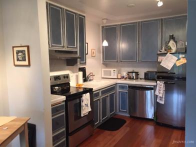 This is a remodeled condo with stainless steel appliances. There is an open floor plan to the dining area and the living room.
