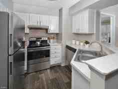 Updated kitchen cabinets with quartz counter tops and laminate hardwood floors throughout. This unit also has central A/C and Heat.