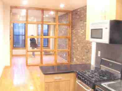 -Glass Architectural wall between bedroom and living room made of reclaimed wood.