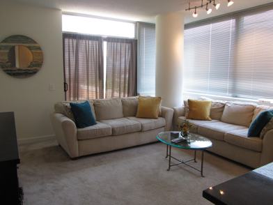 The unit comes with granite counter tops, hardwood floors, washer/dryer, and patio which leads to a one acre community backyard--you can even have our patio set!The master bedroom has a a private bathroom and walk-in closet. The second bedroom is only slightly smaller than the master bedroom. The second bathroom in the hallway. As a corner unit, the living room has large windows overlooking Mt Vernon and Convention center. Lots of natural lighting and best part ...no neighbors!