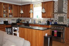 Chefs kitchen with granite counter tops, full backsplash, SS appliances and cherry cabinets.