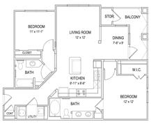 The B2 is our largest two bedroom two bathroom floor plan and is great for entertaining or spending time with your loved ones. It features a state of the art island kitchen, separate living and dining areas, his and hers sinks in the master suite's adjoining bath and a large wrap around patio/balcony with exterior storage. This floor plan is full of character!