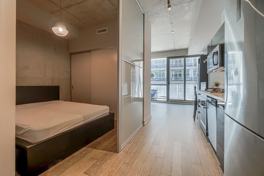 Welcome To The Brant Park In The Heart Of Entertainment District. Partially Furnished One Bedroom With High-End Modern Finishes, Exposed Concrete, Engineered Hardwood Floors, Floor-To-Ceiling Windows, European Style Kitchen, Stone Countertop, Gas Stove,S/S Appliances, And A Big Balcony With Cn Tower View And Overlooking Adelaide St. 99 Walk Score, Steps To Parks, Bars, Restaurants, Public Transit, Shopping, Gym, Etc