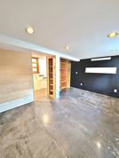 Step down into the living space, where finished concrete floors and a gas range in the kitchen provide a contemporary feel. The spacious bedroom with an attached bath offers privacy and convenience, separated by stylish wooden and glass barn door-style sliding doors. Ample built-in shelving adds storage and the windows drench the space in natural light.