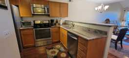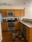 The kitchen features granite tops and stainless-steel appliances. This top floor unit has new split ac in both master bedroom as well as living area. New wood flooring throughout.