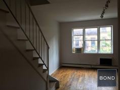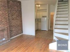 1 bedroom duplex with 2 bathrooms, 2 entrances, hardwood floors, high ceilings, walk in closet, decorative, brick fireplace, a/c and a separate kitchen facing the back and very quiet.
