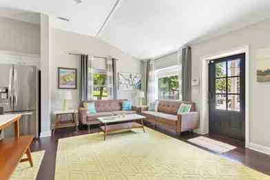 The home is set back off of the street to provide loads of privacy. Walk up the front steps to the charming front porch featuring a small couch and coffee table. Enter through the front door into the open living room, kitchen, and dining area. There is plenty of seating to relax and watch TV, and a large dining table that seats six. The updated kitchen features brand new, stainless steel appliances, a wine fridge, and a Nespresso machine! The door off the kitchen leads to spacious deck and backyard perfect for entertaining.