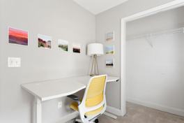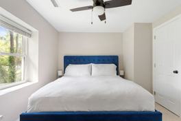 The master bedroom features a king size bed, large walk in closet with sliding barn door, and ensuite bathroom with double vanity and tile shower. The guest bedroom also features a king size bed for ultimate comfort for your guests. There is also a desk in this bedroom to accommodate all of your work from home needs. The additional bedroom doubles as an office with a large desk and features a twin size bed to accommodate additional guests. There is a shared bathroom in the hallway with a combination tub and shower. Each of the king beds and desks are adjustable for ultimate comfort.