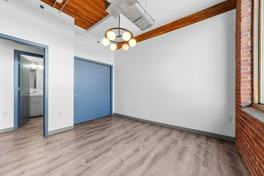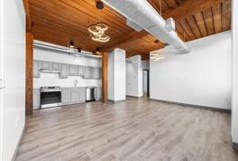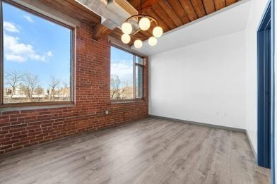 Step inside to find brand-new kitchen appliances, quartz countertops, refinished cabinetry, updated bathroom vanities, fresh paint, new flooring, and upgraded lighting throughout. The open-concept living and dining area highlights exposed brick walls, high ceilings, and a warm, inviting atmosphere.