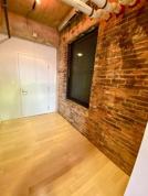 The space embraces an urban loft aesthetic, featuring exposed ceilings and exposed brick that add texture and character throughout. Wide wood flooring runs seamlessly through the unit, enhancing the open layout and warm atmosphere.