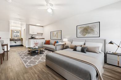 Each studio is unfurnished and has been fully renovated with brand new flooring and appliances, including an air fryer, microwave, 1- burner cook top and a full-size refrigerator.