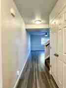 The main level offers an open living space with wood-plank–style laminate flooring. The dining area connects naturally to the kitchen, keeping the layout bright and spacious. The kitchen includes stainless steel appliances and white cabinets that help the room feel light and welcoming.
