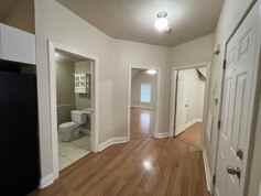 This is 2 bedroom, 2 bathroom apartment on the entire third floor of a renovated home with four apartments. It features double pane windows, hardwood floors, and vaulted ceilings throughout. The ceramic kitchen has a dishwasher, built in microwave, glass top stove, track lighting, a pantry, room for a table, and an open wall that looks out into the living room. There are two full bathrooms with inlaid ceramic tile. The large primary bedroom has a wall of bright windows, a stained glass window, vaulted ceilings, ceiling fan, and private access to one of the bathrooms. The second bedroom is also a nice size with a large closet. As you walk into the apartment you're in a foyer with access to the living room, kitchen, main bathroom, and both bedrooms. There is a fire escape accessible from the kitchen and living room.