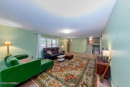 Recently renovated, spacious mid-century modern home featuring a well-appointed kitchen with double ovens and ample counter space. Dining area opens to a private, shaded patio. Interior highlights include updated fixtures, ceiling fans throughout, beautiful interior doors, cast iron balusters, and smart-home features such as keypad entry, smart thermostat with remote sensor, hallway nightlight, and statement doorbell. Bathrooms offer Bluetooth speakers and well-lit defogging vanities. Additional features include high-efficiency washer and dryer, window treatments, screens, dehumidifier, and ample parking. Full garage with A/C and bathroom. Centrally located near downtown and commerce, approximately 20 minutes to Cherry Point.
