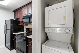This 1-bedroom, 1-bathroom condo offers the perfect blend of modern elegance, convenience, and resort-style living. Perched on the second floor, this home features soaring vaulted ceilings and large windows that flood the space with natural light, creating a bright and airy ambiance. The recently renovated bathroom feels like a spa retreat with its luxurious soaking tub, dual-flush Toto toilet, and beautiful porcelain tile with a marble-look finish.