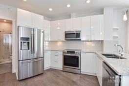 The open-concept layout features a stylish kitchen with stainless steel appliances, quartz countertops, and plenty of cabinet space. Both bedrooms are generously sized, with the primary boasting an en-suite with double sinks.