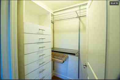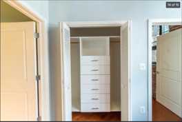 The modern kitchen includes stainless steel GE Profile appliances, and the unit comes with the convenience of an in-unit washer and dryer, abundant storage, and two full bathrooms.