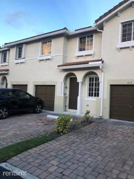 A must see beautiful 4 bedrooms and 21/2 bathrooms townhouse, 1 car garage and 2 more spaces in driveway. Ceramic tile downstairs and laminate upstairs, recently painted. Great GATED, secure, quiet community with amenities on Dade Broward line close to all major highways. All ages welcome. Easy to show on lockbox. Owner requires 1 month and 2 months deposit.
