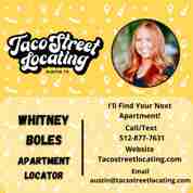 ---- SCHEDULE A SHOWING ONLINE AT: http showmojo com llz d01c1670cb ---- Looking for an apartment in Austin? Let me help you find your next home! I\'m Whitney with Taco Street Locating. We\'ve helped hundreds of people find new apartments all over Austin, and we\'re 100% free to work with. Check out our website for more deets! Step by step. Hour by hour. The days go by. How many years has it been? 5? 10? 30? Who knows. You\'ve been walking for years after you ate those funky plants that convinced you to go on a lifelong vision quest to find that perfect apartment. Many times you\'ve almost given up hope. So many years waiting. And then as if on cue from some benevolent celestial being, the skies part, the sun comes out, flowers begin to blossom and a magnificent building appears. No, it\'s not real. It must be a mirage like all the others. But behold! The building that has occupied your obsessive vison has come at last. It has everything you ever envisioned. Granite countertops, gas stovetops, and even a resort style pool. Whoa! It\'s even better than you imagined. Your years of dedicated searching have paid off! Welcome to your new home. ___________________________________________________________ Apartment Amenities Attached Garages and Detached Available Upgraded front cabinets ___________________________________________________________ Community Amenities Package Service- Parcel Pending Wi-Fi at Pool and Clubhouse Controlled Access Maintenance on site 24 Hour Availability Trash Pickup - Door to Door Renters Insurance Program Planned Social Activities Pet Friendly Business Center Clubhouse Lounge Coffee Bar Tanning Salon Gated Fenced Lot Sundeck Cabana Pond Fitness Center Free Weights Weight Machines Spa
