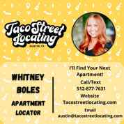 ---- SCHEDULE A SHOWING ONLINE AT: http showmojo com llz 03a54b20cc ---- Looking for an apartment in Austin? Let me help you find your next home! I\'m Whitney with Taco Street Locating. We\'ve helped hundreds of people find new apartments all over Austin, and we\'re 100% free to work with. Check out our website for more deets! Step by step. Hour by hour. The days go by. How many years has it been? 5? 10? 30? Who knows. You\'ve been walking for years after you ate those funky plants that convinced you to go on a lifelong vision quest to find that perfect apartment. Many times you\'ve almost given up hope. So many years waiting. And then as if on cue from some benevolent celestial being, the skies part, the sun comes out, flowers begin to blossom and a magnificent building appears. No, it\'s not real. It must be a mirage like all the others. But behold! The building that has occupied your obsessive vison has come at last. It has everything you ever envisioned. Granite countertops, gas stovetops, and even a resort style pool. Whoa! It\'s even better than you imagined. Your years of dedicated searching have paid off! Welcome to your new home. ___________________________________________________________ Apartment Amenities Attached Garages and Detached Available Upgraded front cabinets ___________________________________________________________ Community Amenities Package Service- Parcel Pending Wi-Fi at Pool and Clubhouse Controlled Access Maintenance on site 24 Hour Availability Trash Pickup - Door to Door Renters Insurance Program Planned Social Activities Pet Friendly Business Center Clubhouse Lounge Coffee Bar Tanning Salon Gated Fenced Lot Sundeck Cabana Pond Fitness Center Free Weights Weight Machines Spa