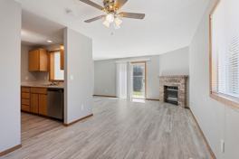 A spacious living room with a sliding glass patio door leads out to the wood deck and enclosed yard. A gas fireplace will keep you warm during those cool winter nights.