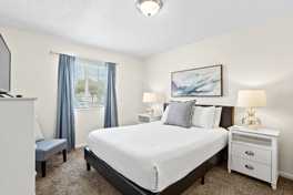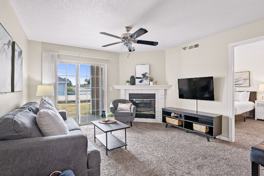 The unit is spacious but also offers all the accommodations of home. As you enter the front door, you'll find a coat closet and an entry table. The dining room has seating for 4 with additional seating for 2 at the eat-in kitchen. The kitchen has all the appliances you would need (toaster, Keurig, microwave, etc) as well as bakeware, kitchen gadgets, etc. Just off the kitchen is the full-size washer/dryer with drying rack, iron, etc. The living room is cozy with a gas fireplace, couch, side chair and a slider to the patio. The 55" smart TV is ready to go for streaming or there are included channels as well! Wifi is available throughout the unit and you'll also find a pack n' play and high chair. Off the main living area is a full-size bathroom and bedroom. The primary bedroom offers a queen bed, television, room darkening curtains and dresser. The primary has its own bathroom with shower and walk-in closet. Both bedrooms have mini-blinds as well as room darkening curtains.